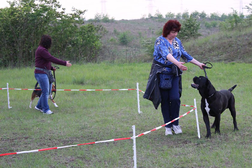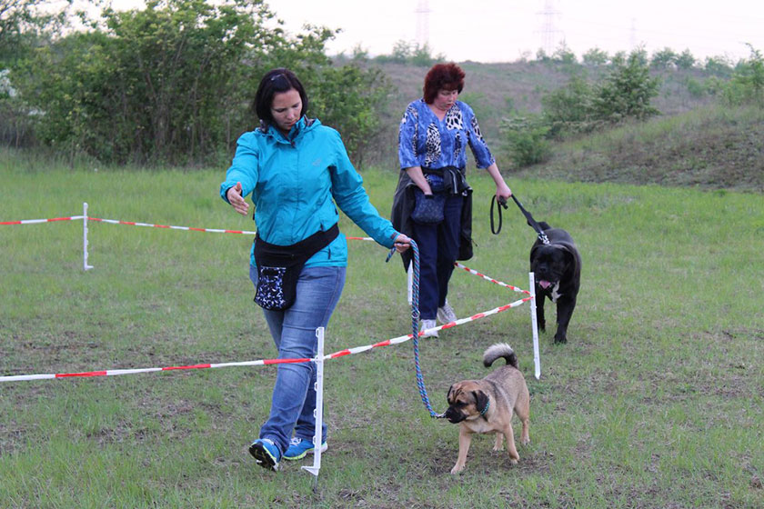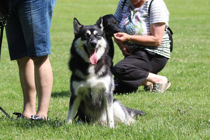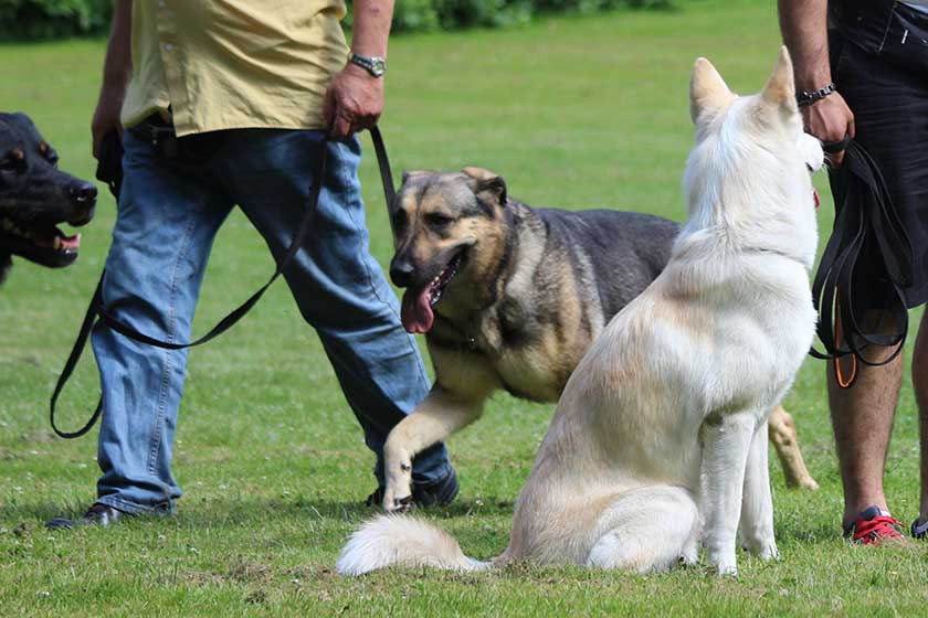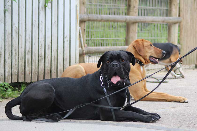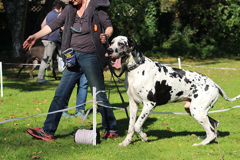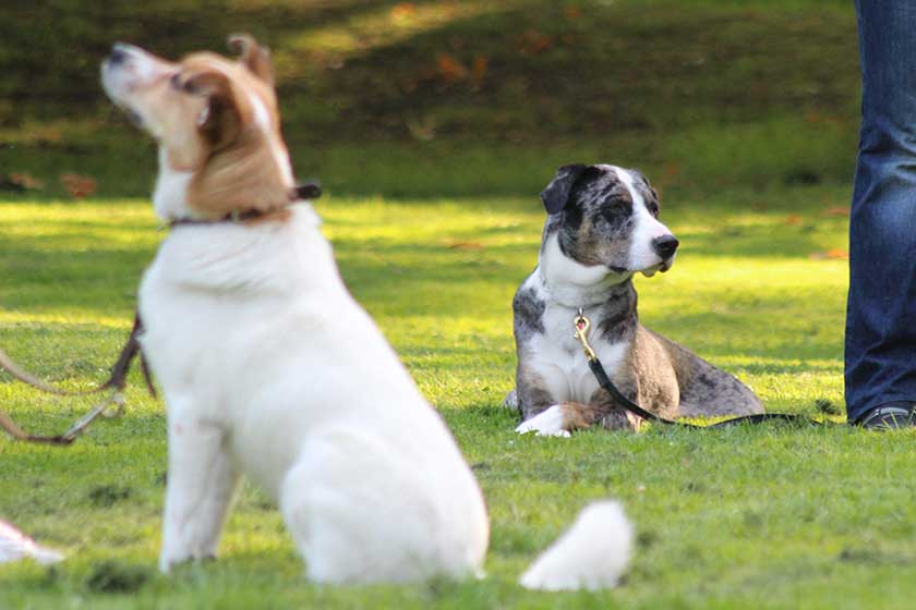 Die Hunde sitzen zwischen den fremden Tieren und dürfen ihren Platz nicht verlassen - trotz großer Ablenkung.