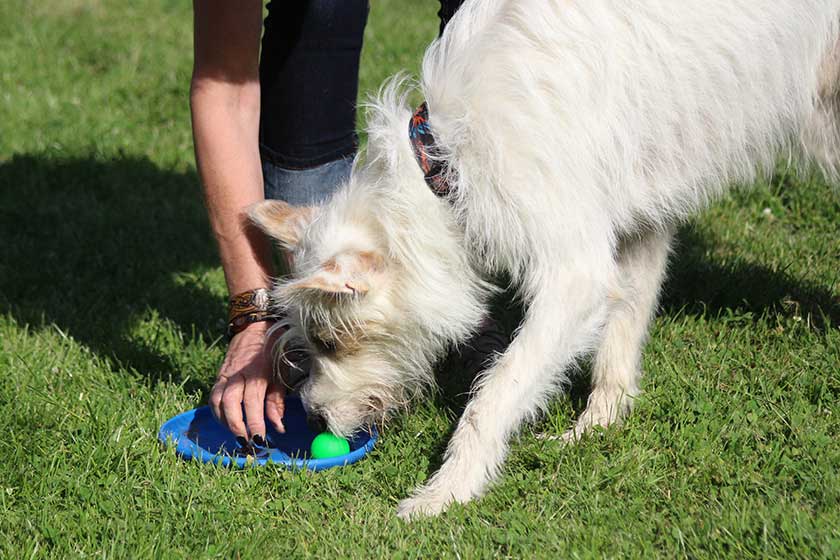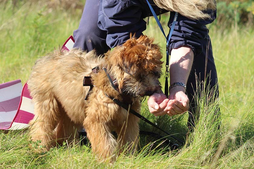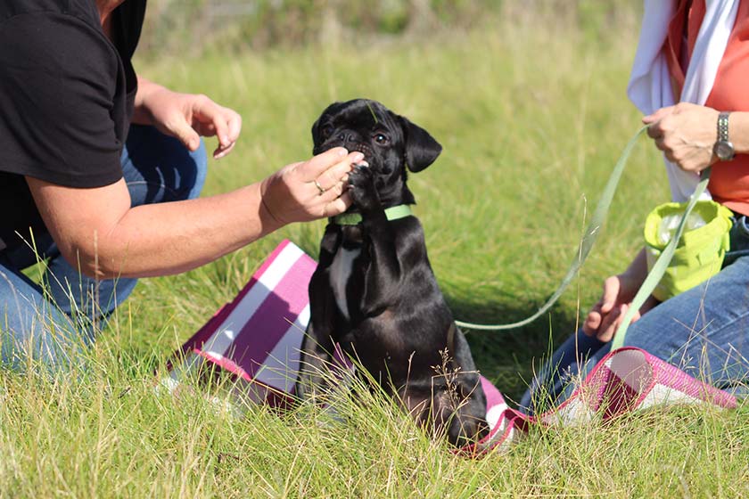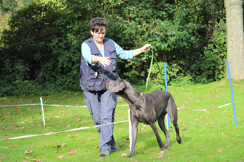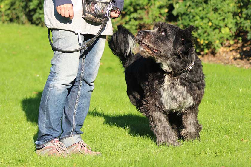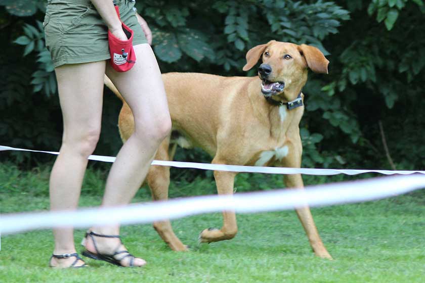 Cooper "dockt" schon einmal am Leckerchen an. Dann ab in die Platzübung...