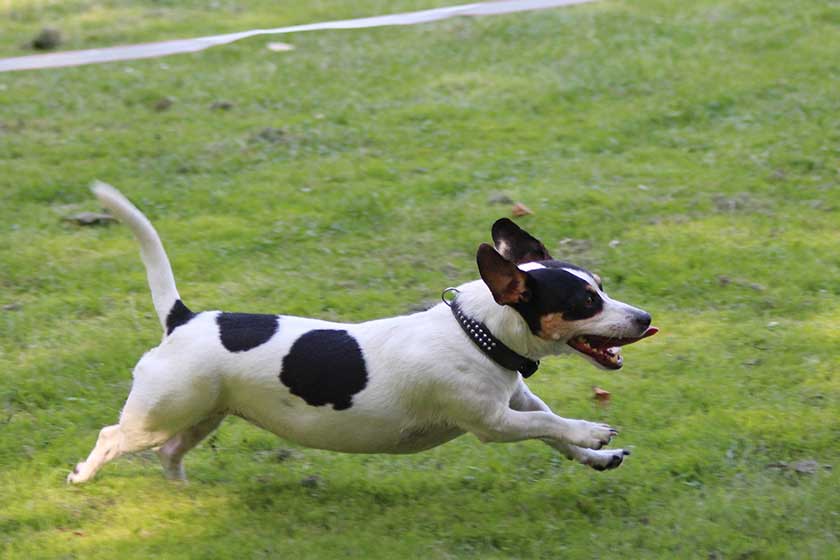 Gibt auf ihren kurzen Beinen Alles... als sie in rasender Geschwindigkeit zum Wurstnapf zurück flitzt.