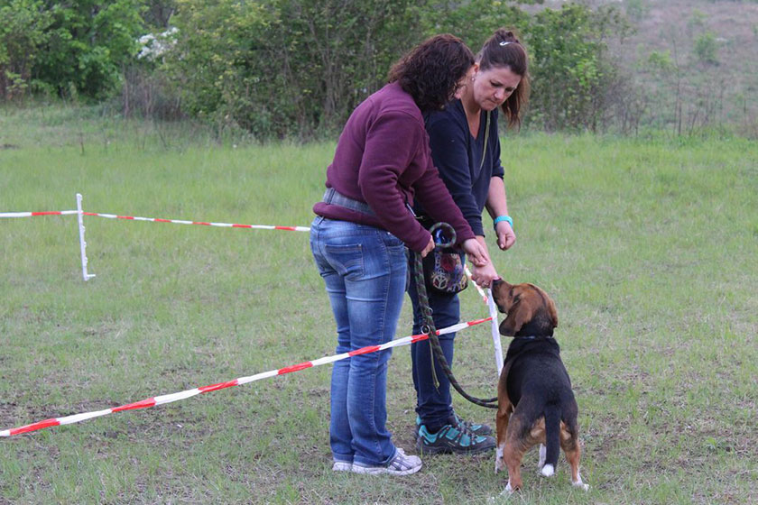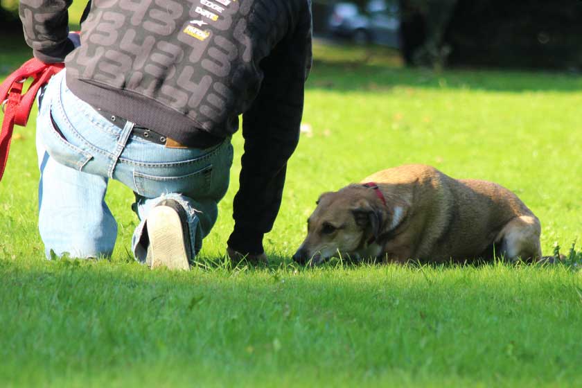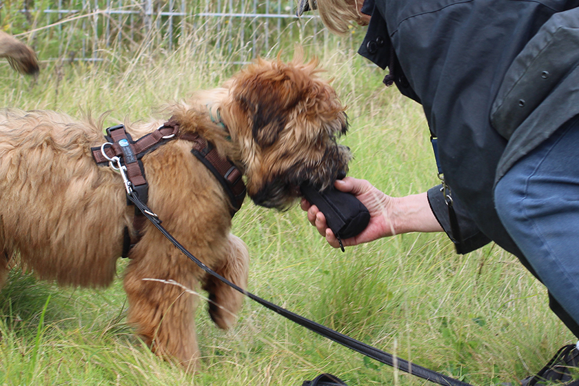 Bella wird bei der "Sitz - und warte bis ich dich wieder abhole"-Übung festgehalten. Sie ist noch eine sehr zurückhaltende Hündin und braucht viel Sicherheit.