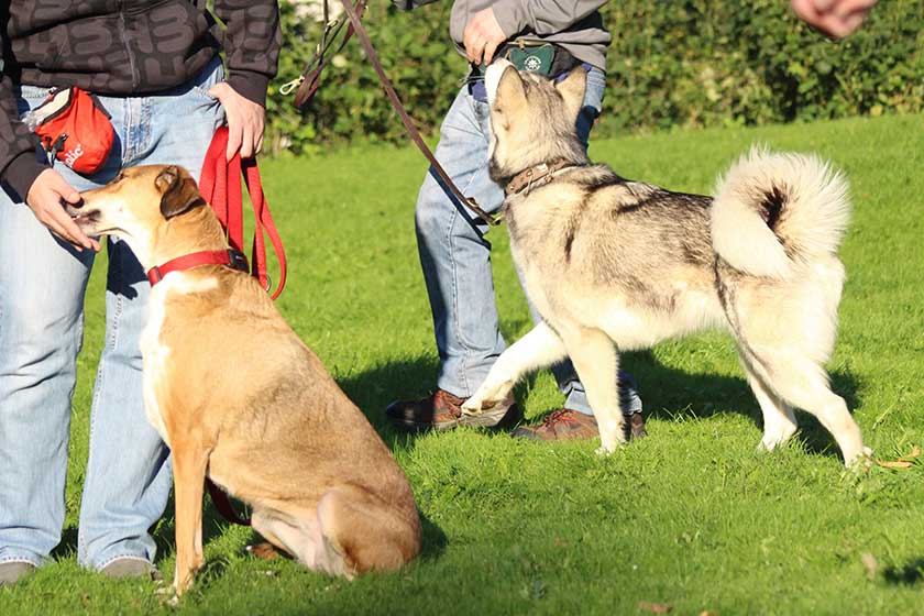 Ivy zeigt dem anderen Hund deutlich, dass sie noch etwas unsicher ist und es langsam angehen möchte.