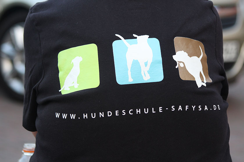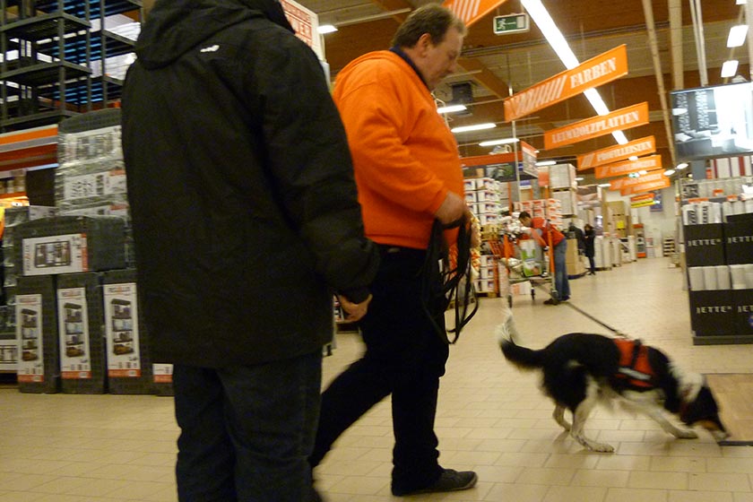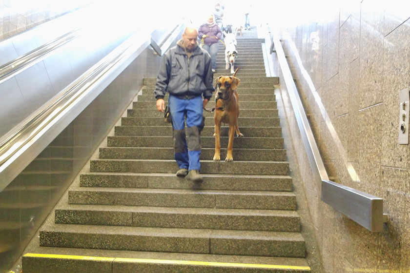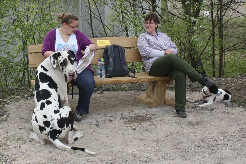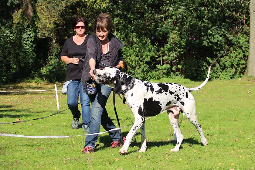 Durch seine Größe zieht er natürlich alle Blicke auf sich. Sabine nutzt die Chance und erklärt Passanten, wie man sich einem Hund richtig nähert und durch welche Körperhaltung (Überbeugen) man einem Hund Angst macht, bzw. ihn bedroht.