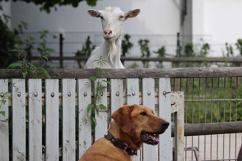 Die Ziege bleibt aufmerksam und schaut sich auch die zweite Unterrichtsstunde genau an.