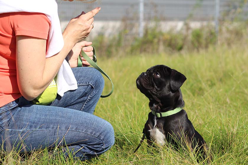 Leo sitzt bereits und wird mit einem Leckerchen...