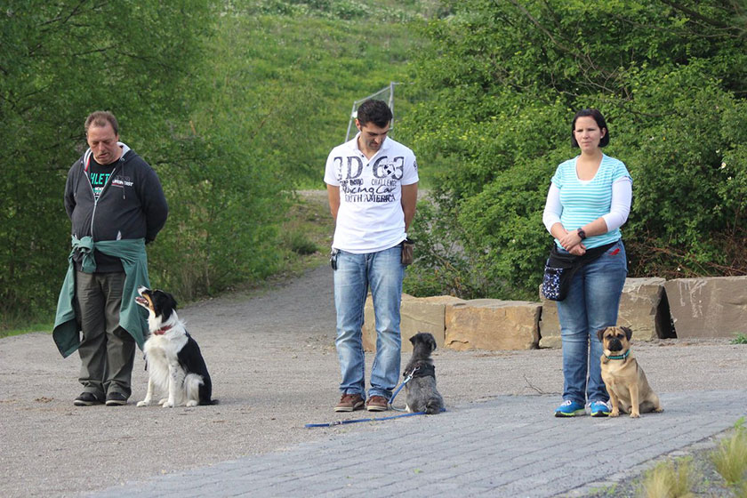Auch dieser Gruppe der Junghunde bleibt eine Sitzübung unter Ablenkung nicht erspart. Denn Übung macht den Meister.
