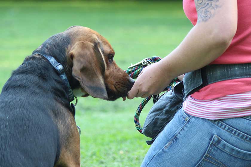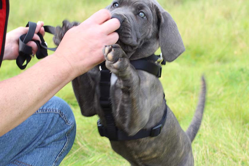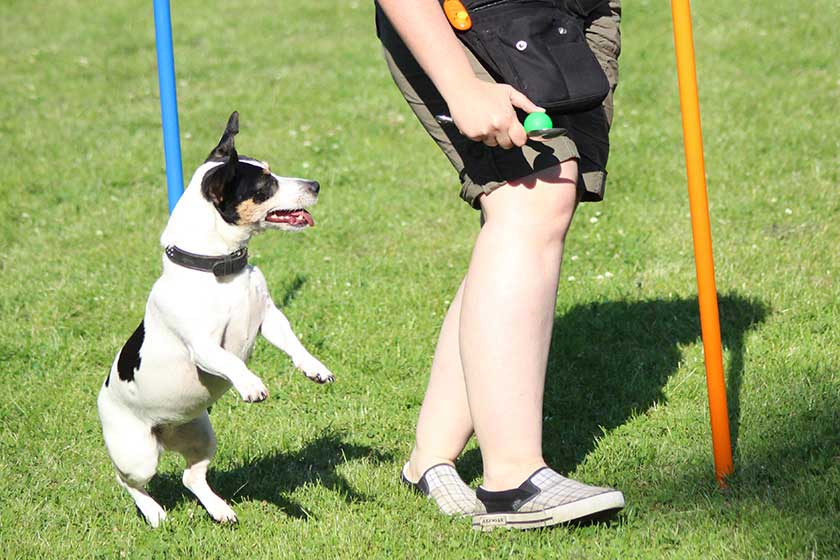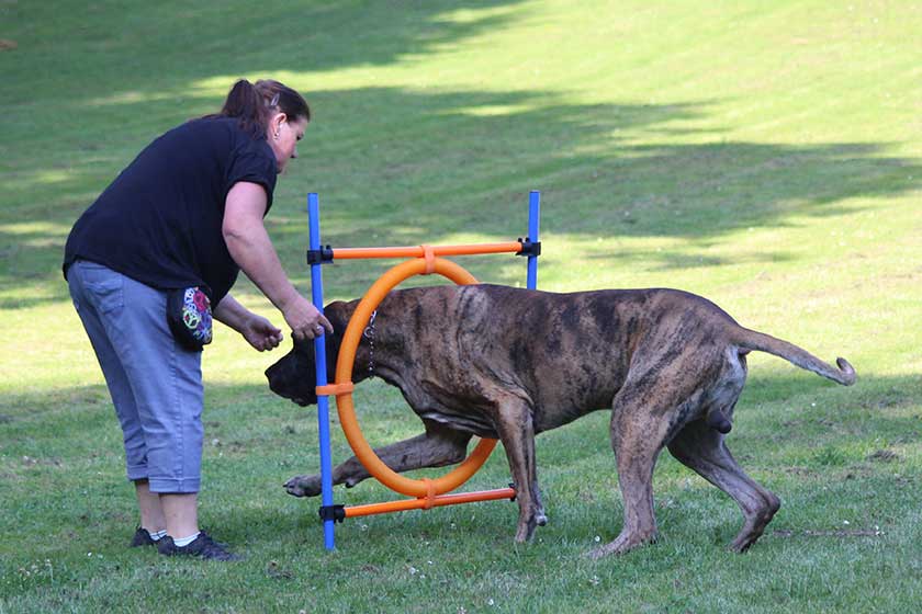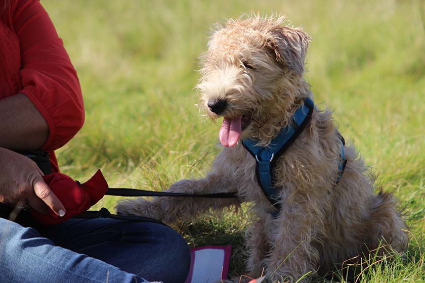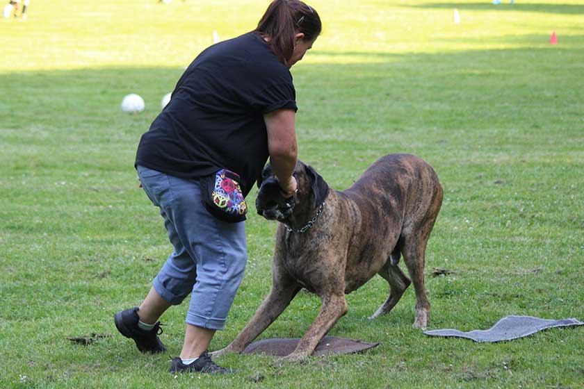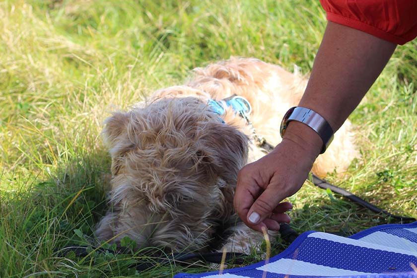 Cooper "dockt" schon einmal am Leckerchen an. Dann ab in die Platzübung...