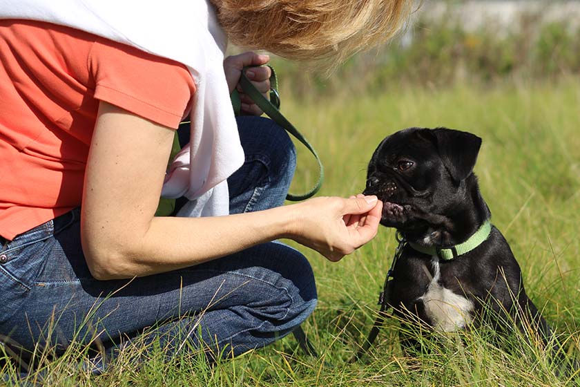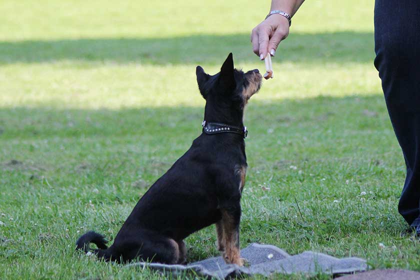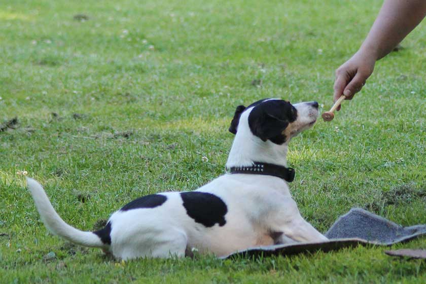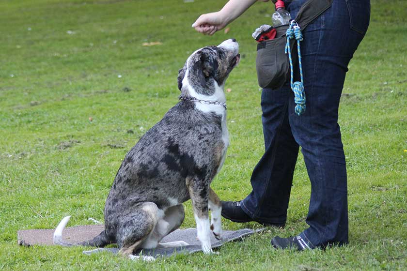 Leo sitzt bereits und wird mit einem Leckerchen...