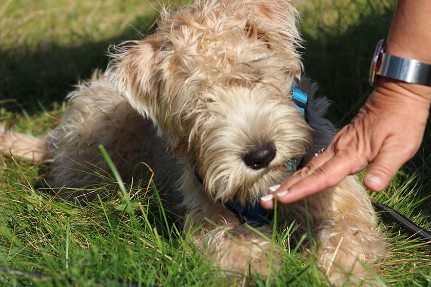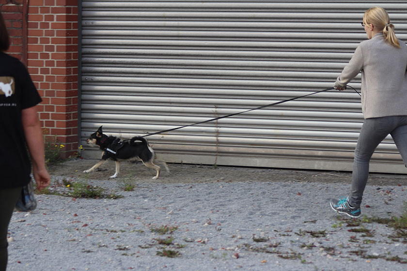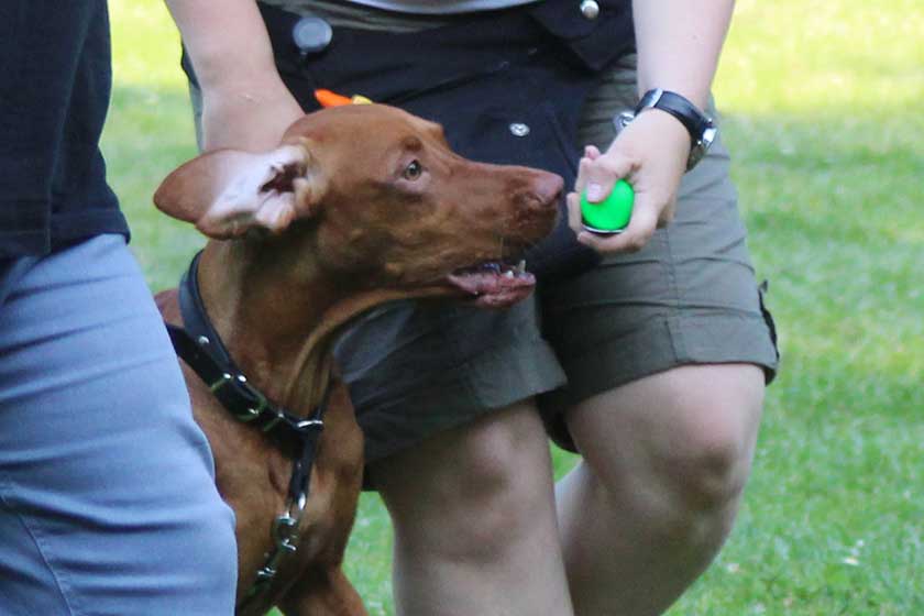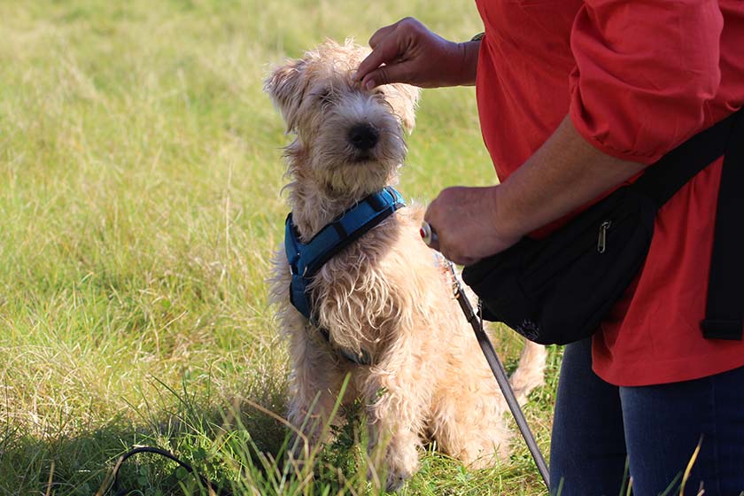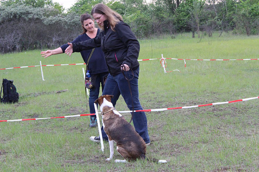 Bella wird bei der "Sitz - und warte bis ich dich wieder abhole"-Übung festgehalten. Sie ist noch eine sehr zurückhaltende Hündin und braucht viel Sicherheit.
