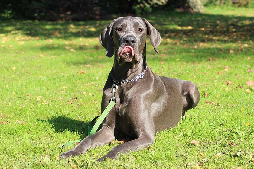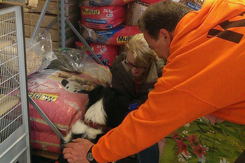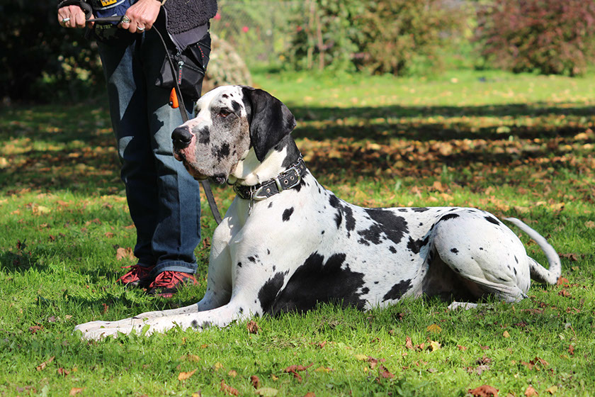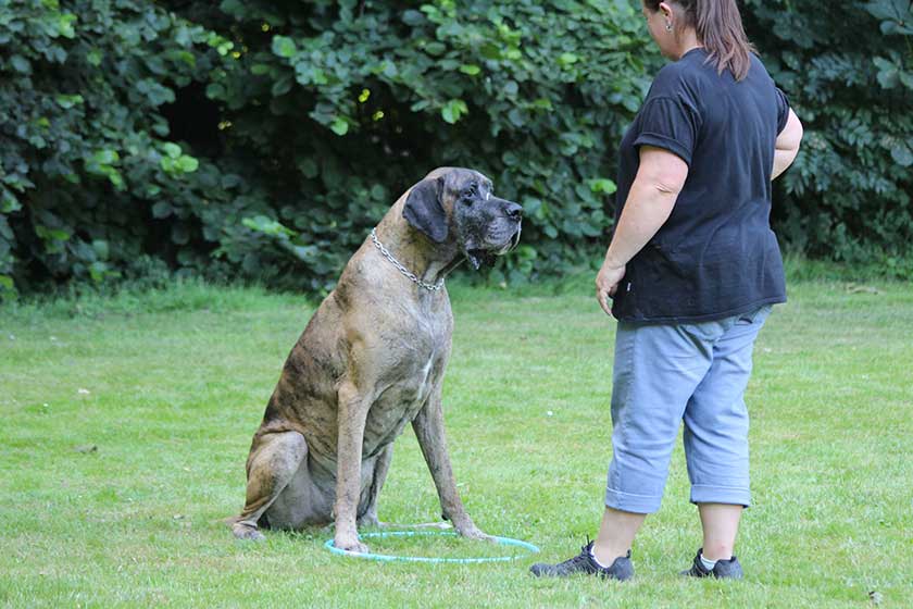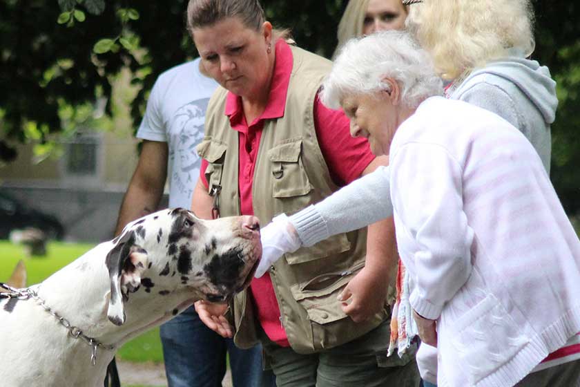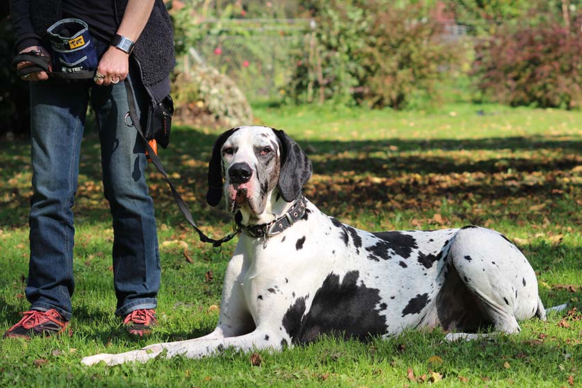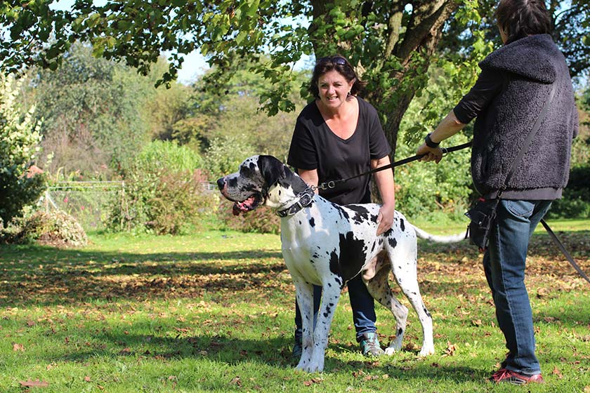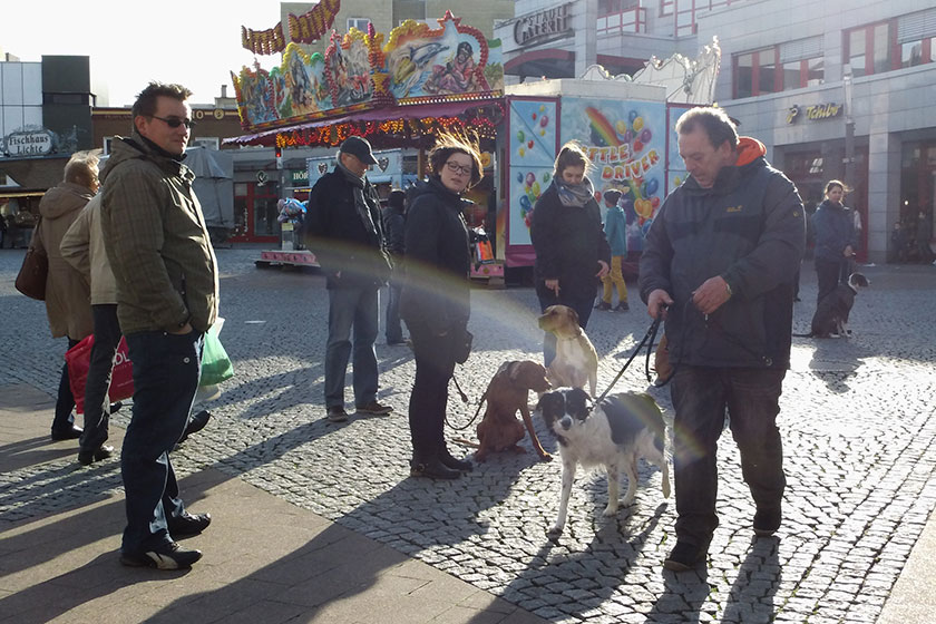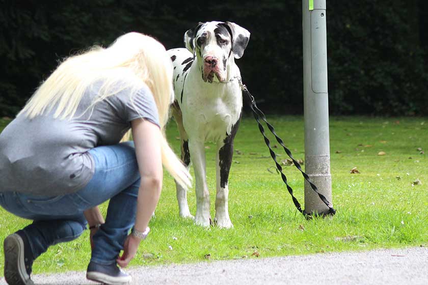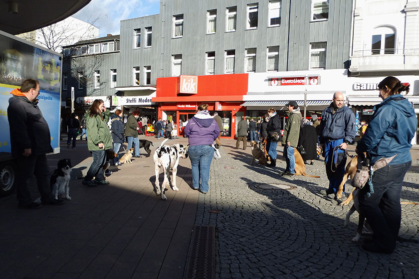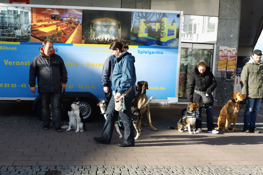 Durch seine Größe zieht er natürlich alle Blicke auf sich. Sabine nutzt die Chance und erklärt Passanten, wie man sich einem Hund richtig nähert und durch welche Körperhaltung (Überbeugen) man einem Hund Angst macht, bzw. ihn bedroht.