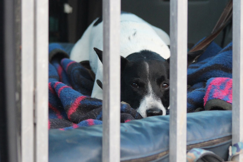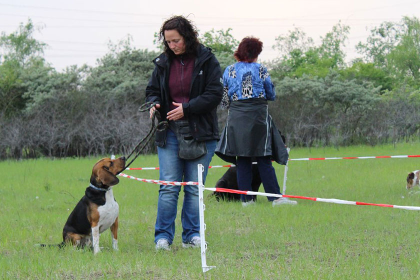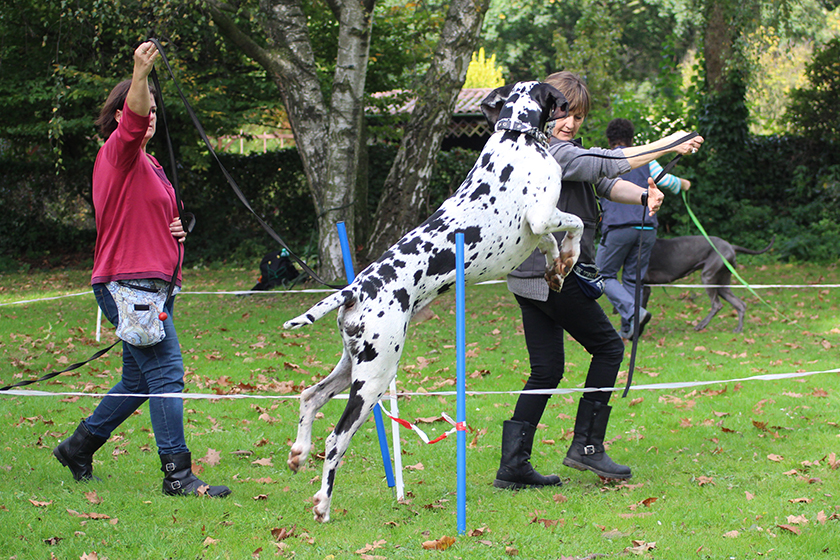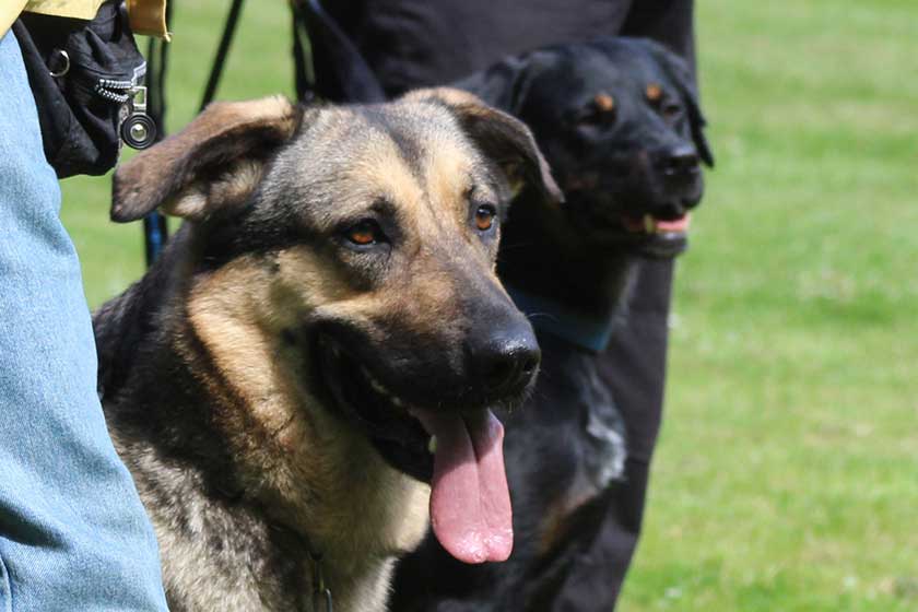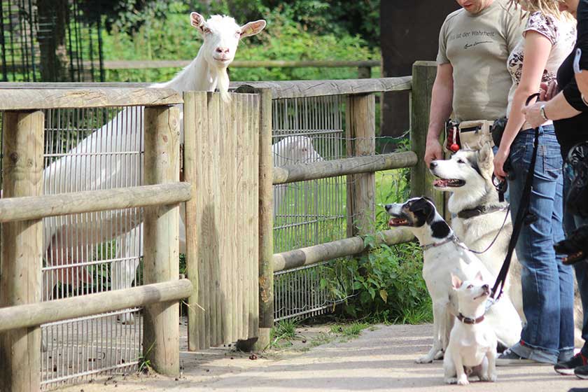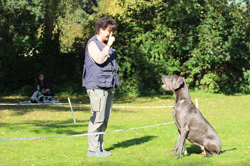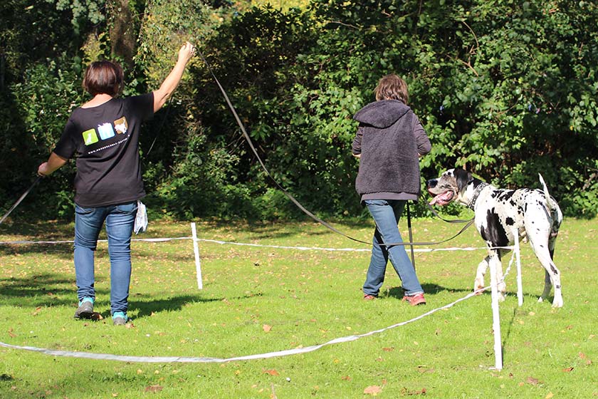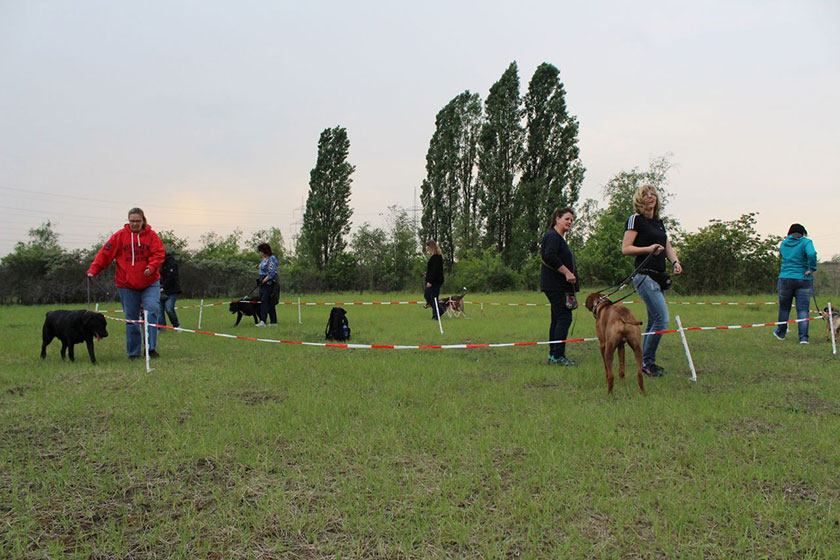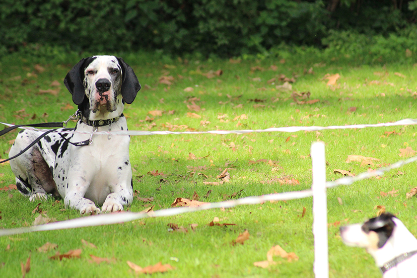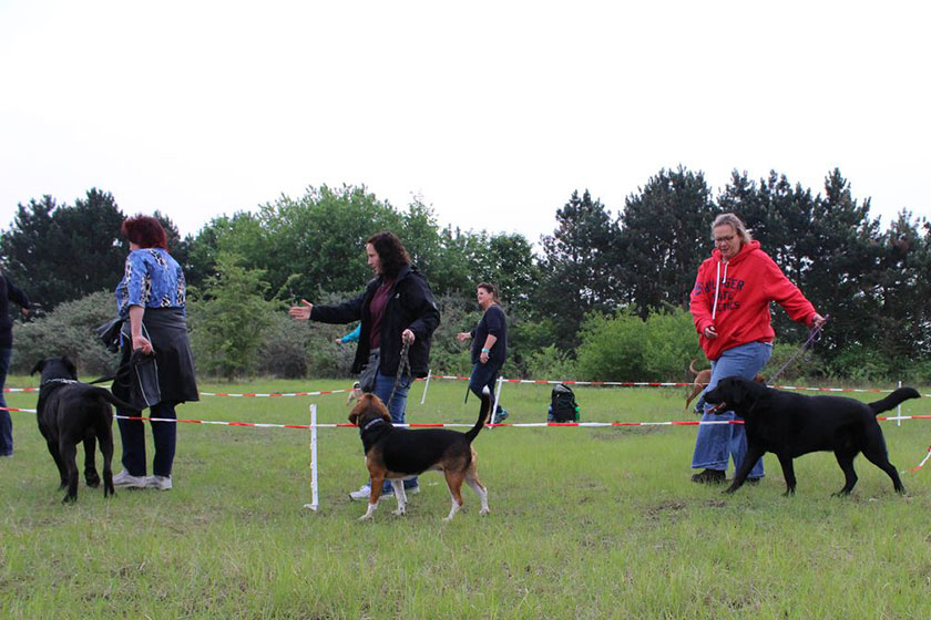 Die Hunde sitzen zwischen den fremden Tieren und dürfen ihren Platz nicht verlassen - trotz großer Ablenkung.